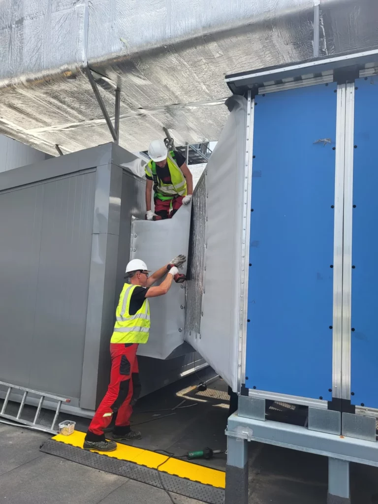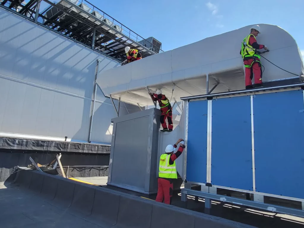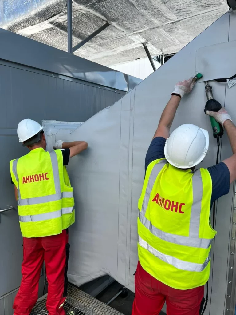 “На кровле для охлаждения серверов установлены большое количество вентоборудования, корпуса которого были негерметичны и приводили к протечкам. Мы обтянули все проблемные воздуховоды ПВХ-мембраной. Работа максимального уровня сложности по ручной сварке горячим воздухом“.