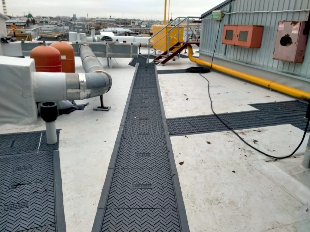 “Это была одна из самых сложных наших работ: большое количество нестандартных узлов и примыканий, которые предстояло обтянуть мембраной. Много ручной сварки горячим воздухом. Невозможность поставить автокран в центре города и необходимость поднимать и спускать все материалы для ремонта в лифте, размерами 1×1 м, в руках“.