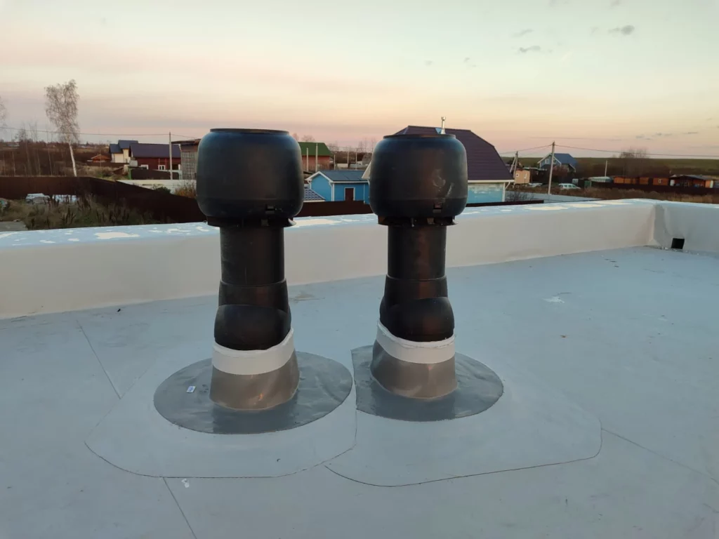 “Монтировали типовой пирог кровли с переливными парапетными воронками и полным оборачиванием парапетов гидроизоляцией из мембраны. Дополнительно выполнили личный каприз от Заказчика – установили аэраторы“.