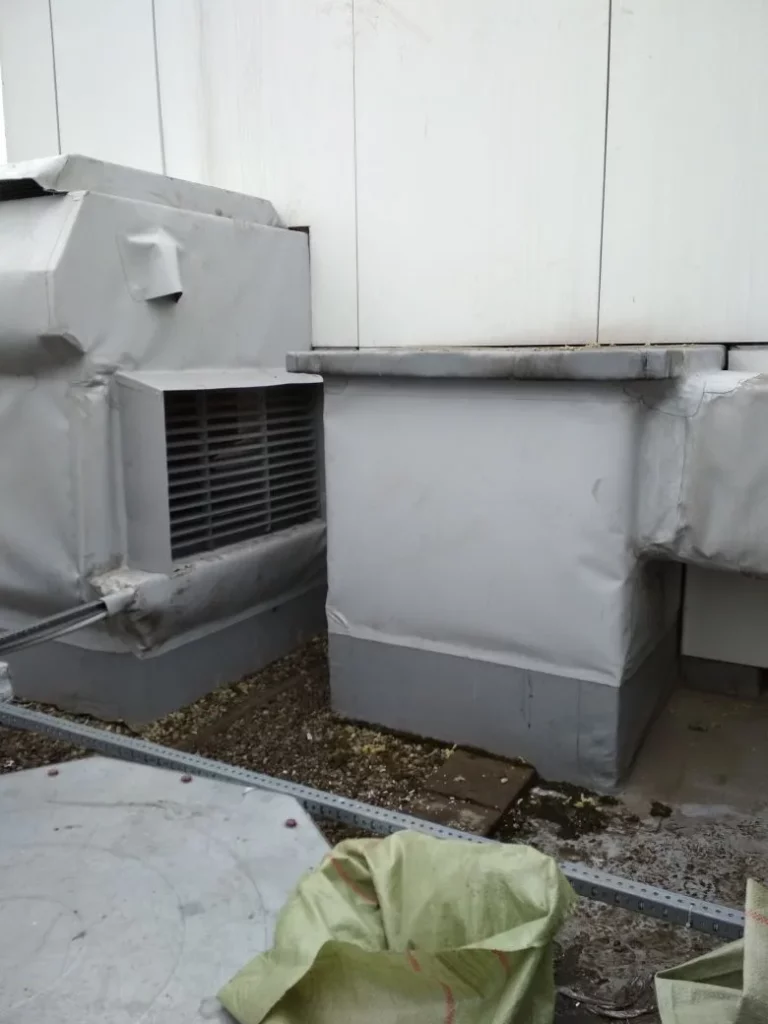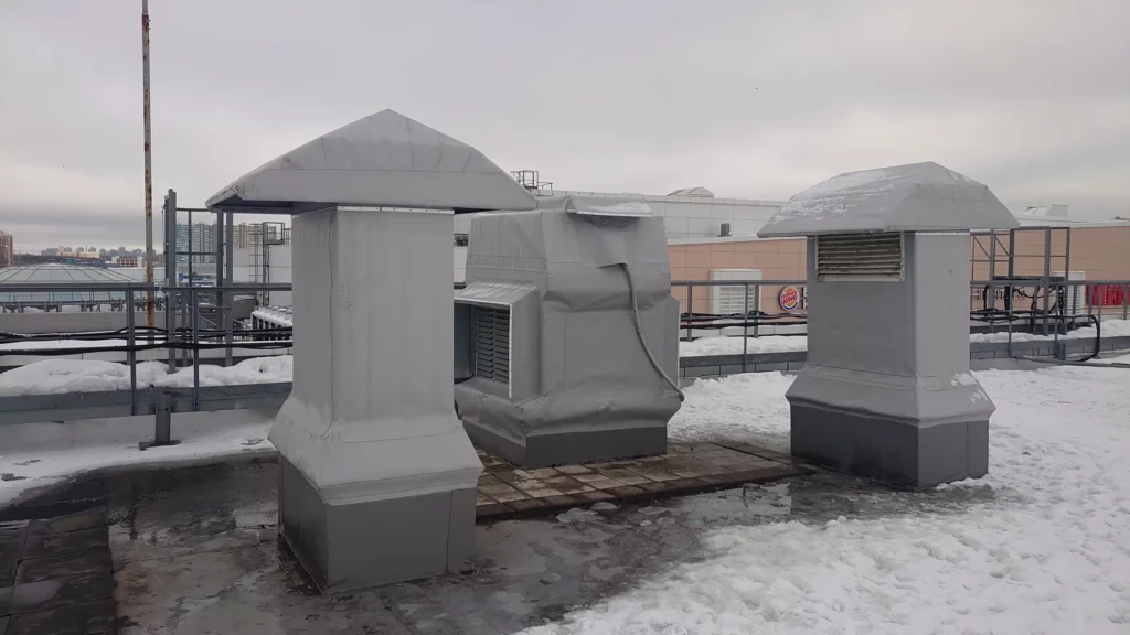 Монтаж ПВХ мембраны на вентиляционное оборудование на кровле ТЦ Монпансье