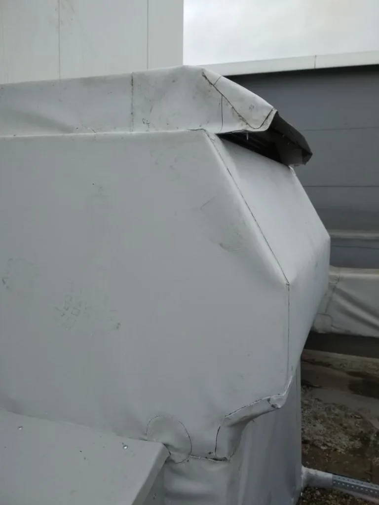“На кровле протекали 3 вентшахты и 2 вентилятора дымоудаления. Для устранения протечек навсегда надо было не только обтянуть корпуса ПВХ мембраной, но еще и нарастить металлические козырьки над дефлекторными решетками вентиляторов дымоудаления. Протечек больше нет и не будет“.